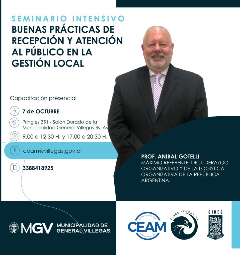 Ya está abierta la inscripción al seminario “Buenas Prácticas de Recepción y Atención al Público en la Gestión Local”, dictado por el Prof. Aníbal Gotelli y organizado por CEAM – Secretaría de Educación de la Municipalidad de General Villegas y CIDEC Argentina